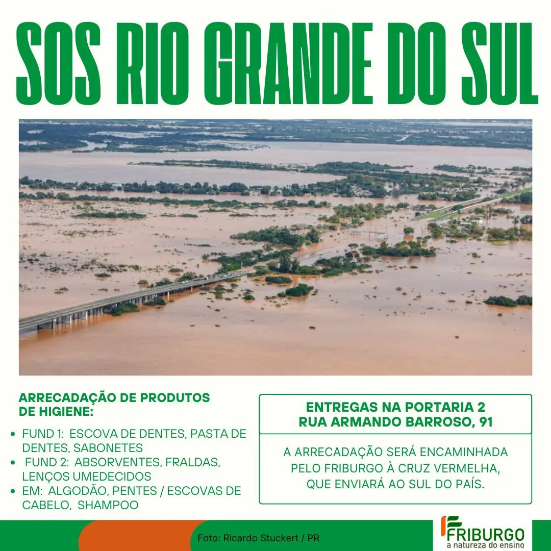 COLÉGIO FRIBURGO PROMOVE CAMPANHA PARA AJUDAR VÍTIMAS DAS ENCHENTES. PARTICIPE! As fortes chuvas que castigaram o Rio Grande do Sul provocaram a maior tragédia da história do estado. Até agora, mais de uma centena de pessoas perdeu a vida, outras tantas estão desaparecidas, milhares estão desabrigadas e centenas de milhares perderam tudo o que tinham.…